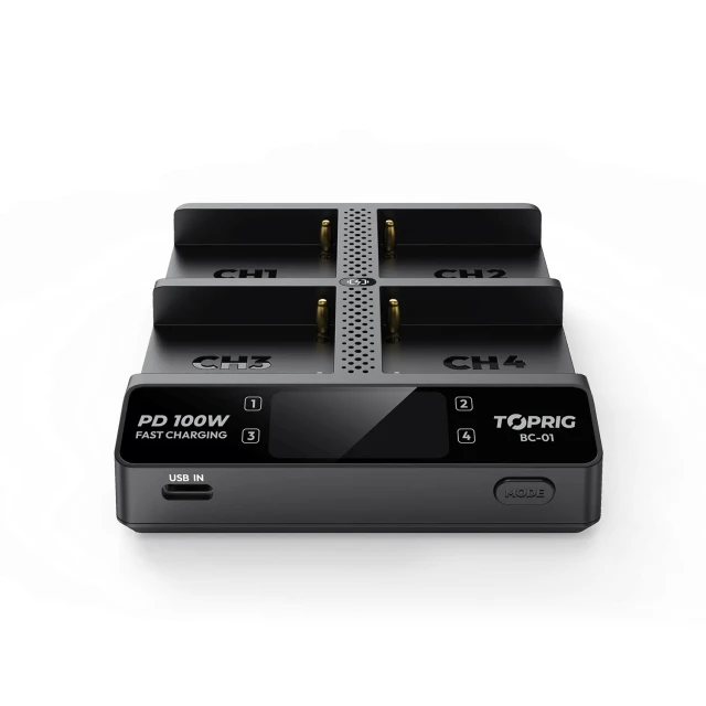 Accsoon TopRig 100W 4-Bay NP-F brzi punjač je kompaktno, visokoučinkovito rješenje za punjenje s pametnom tehnologijom punjenja, LCD zaslonom u boji i USB-C PD ulazom, dizajnirano za brzo i sigurno punjenje Sony NP-F serije baterija.