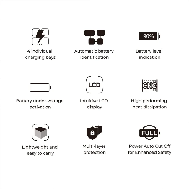 Opremljen s četiri neovisna mjesta za punjenje, punjač ima pametni način punjenja koji automatski prepoznaje vrste baterija i u skladu s tim prilagođava izlaznu struju, puneći svaku bateriju pojedinačno za optimalnu učinkovitost i dugotrajnost. Također podržava aktivaciju podnapona baterije, omogućujući sigurno oživljavanje duboko ispražnjenih baterija.