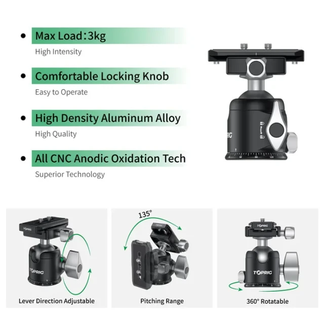 Accsoon ACC-BH-01 TopRig kuglasta glava je kompaktna, ali snažna aluminijska glava stativa s glatkom panoramskom rotacijom od 360°, pločom za brzo otpuštanje i širokom kompatibilnošću s kamerama, stativima i monopodima.