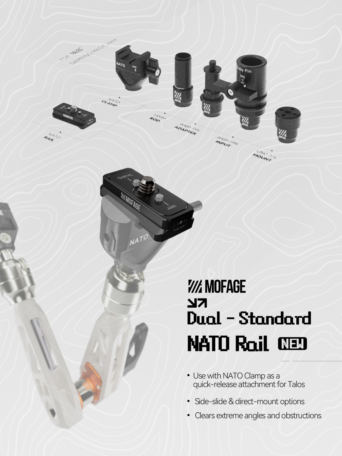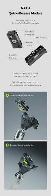 Dvostruki standard (Arri i SmallHD) NATO nosač dizajniran je kako bi montažu učinio svestranijom i praktičnijom, povećavajući mogućnosti cijele vaše postavke.