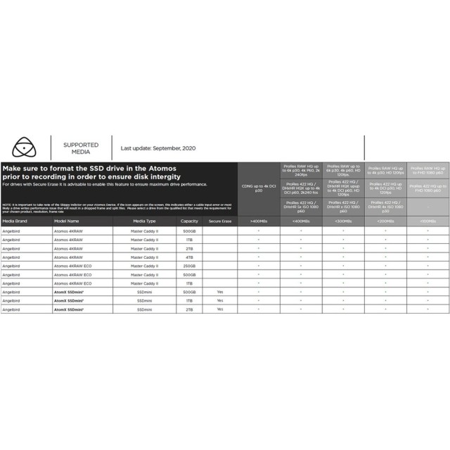 Angelbirdov AtomX SSDmini posebno je izrađen za novi snimač monitora Atomos Ninja i savršeno je kompatibilan sa svim ostalim dostupnim snimačima. AtomX SSDmini je 20 posto manji od prosječnog SSD-a (kako bi odgovarao malom otisku Ninje), nudi 1 TB prostora za pohranu, ima postojane brzine čitanja od 540 MB/s i brzine pisanja od 500 MB/s, snima CDNG do 4K 30p, ProRes RAW HQ 5.7K do 30p, plus 4K 60p i 2K 240p, ima SATA III konektor i podržava Stable Stream™ tehnologiju da nikad ne propustite nijedan kadar.