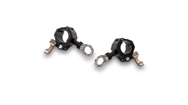 Armorman 3.0 nadzemna konfiguracija gimbal prstenasta adapterska stezaljka. Ako imate gimbal koji se temelji na prstenu, prstenaste adapterske stezaljke za konfiguraciju kardana iznad glave omogućuju jednostavno rješenje za brzo otpuštanje za pričvršćivanje i odvajanje vašeg kardana na mehaničke ruke Armor Man 3.0 kada je u načinu rada iznad glave. Stezaljke se pričvršćuju na lijevu i desnu stranu vrha gimbalnog prstena, a nakon što se remenice kabela za nadzemnu konfiguraciju pričvrste na svaku ruku Armor Man-a, operater može jednostavno koristiti karabinere rastezljivih bungee kabela za pričvršćivanje na gimbal da zatim počne raditi. Kada želite odvojiti gimbal, oslobodite karabinere sa stezaljki.