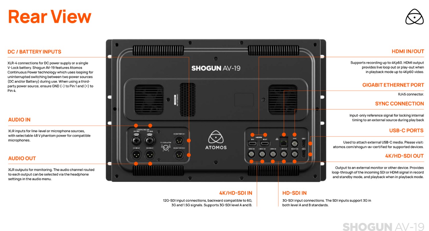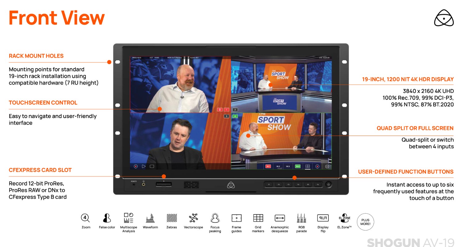 ATOMOS Shogun AV-19 je moćan19-inčni 4K HDR DCI-P3 monitor-rekorder-preklopnik dizajniran za profesionalnu produkciju uživo, emitiranje i video-village okruženja.
