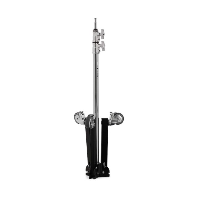 Maksimalna visina je 170 cm/66,9 inča i može izdržati do 12 kg/26,5 kg. Ovaj stalak ima sklopivu bazu s kotačima i dugačak je samo 98 cm/38,6 inča kada je stalak umetnut i kotači preklopljeni. S pribadačom za bebe promjera 16 mm/5/8 inča, može se lako pričvrstiti na bilo koju šablonu, glavu za držanje ili bebi prijemnik.
