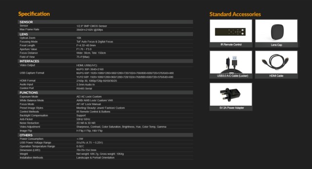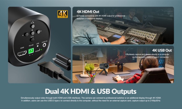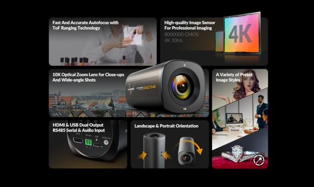 Nova kompaktna 4K kamera s HDMI i USB-C sučeljima (simultani izlaz do 3840p30) za snimanje i streaming, integriranim širokokutnim zum objektivom ( 10x ) i 8 Mpx 1/2.8" CMOS senzorom .