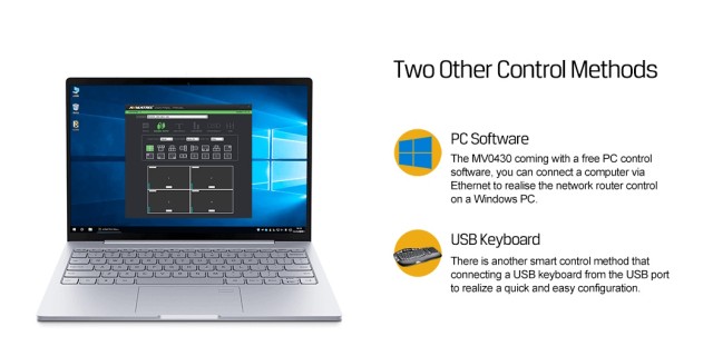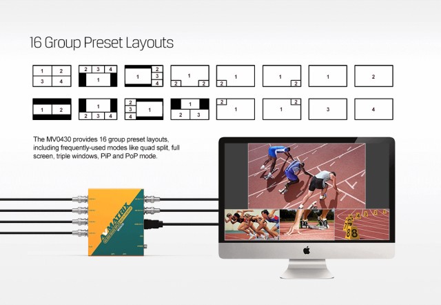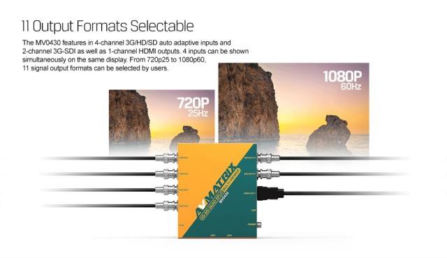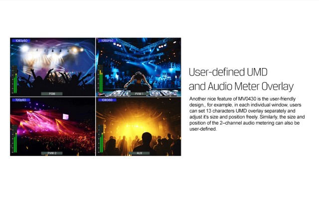 MV0430 je izvrstan i profesionalan SDI multiviewer opremljen 4-kanalnim 3G/HD/SD-SDI auto-adaptivnim ulazima i 2-kanalnim 3G-SDI i 1-kanalnim HDMI izlazima. Postoji ukupno 16 unaprijed postavljenih izgleda za odabir. Korisnici također mogu slobodno prilagoditi veličinu i položaj UMD sloja s 11 znakova i mjerača zvuka. Sve funkcije mogu se jednostavno postaviti pomoću ugrađenog DIP prekidača ili računala putem LAN-a. MV0430 je idealan izbor za AV aplikacije za emitiranje i postprodukciju.