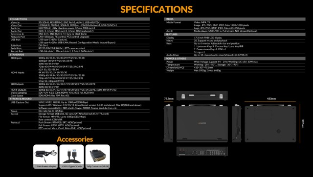 AvMatrix Shark S8X Plus-NDI moćan je 8-kanalni video switcher sa 17,3-inčnim FHD IPS zaslonom, višestrukim SDI/HDMI ulazima, naprednim mogućnostima strujanja (RTMP/SRT/NDI), profesionalnim XLR audiom, PTZ kontrolom i prilagodljivim usmjeravanjem s više prikaza. Idealno za emitiranje uživo i profesionalnu video produkciju.