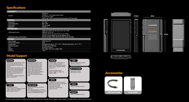 AVMatrix Vlog Selfie monitor. 3×Type-C porta; USB-C OUT podržava OTG funkciju za spajanje USB dodataka poput dopunskih svjetala i pruža izlaz napajanja. Kompatibilan s većinom vodećih pametnih telefona s potpuno funkcionalnim Type-C priključcima; podržava 1080p HDMI ulaz. 3,97-inčni zaslon s interakcijom dvaju zaslona u stvarnom vremenu.