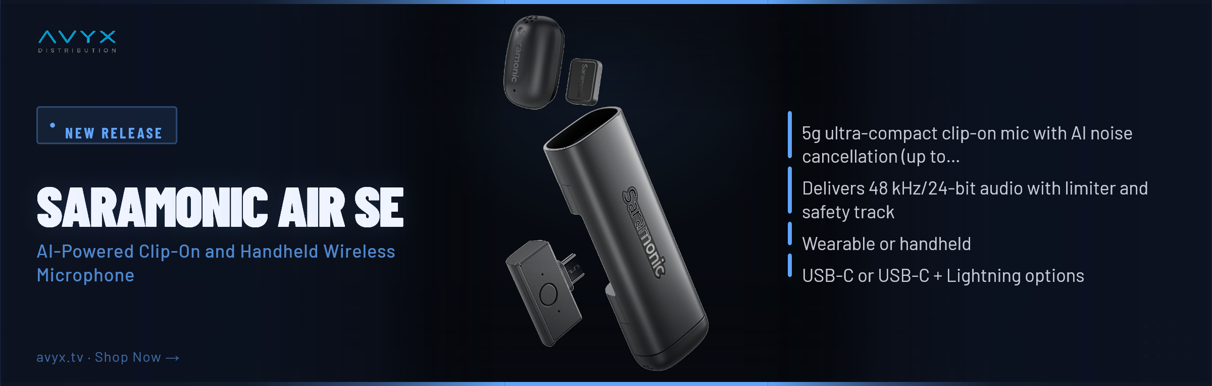 Introducing the Saramonic Air SE, a revolutionary ultra-compact clip-on microphone that redefines portable professional audio. At just 5 grams, this featherweight powerhouse delivers exceptional 48 kHz/24-bit audio quality with advanced AI noise cancellation reducing unwanted sound by up to 40 dB. The built-in limiter and safety track ensure your recordings stay pristine even in challenging conditions. Versatile enough to be worn or handheld, the Air SE offers flexible connectivity with USB-C or USB-C + Lightning options to match your workflow. Whether you're a content creator, journalist, or filmmaker, this innovative microphone brings studio-quality sound to any location. Available to pre-order now at avyx.tv