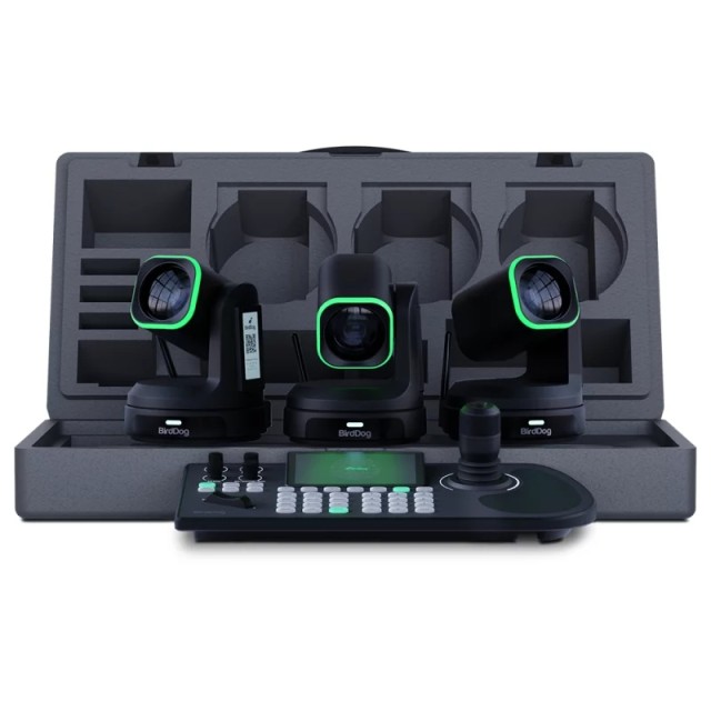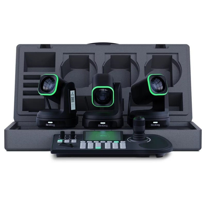 BirdDog X1 Ultra paket u crnoj boji uključuje tri X1 Ultra 4K PTZ kamere i KBD kontroler u pjenastom kućištu . Ovaj paket donosi profesionalne slike i objedinjenu kontrolu streaming studijima, korporativnim AV prostorima i vjerskim objektima.