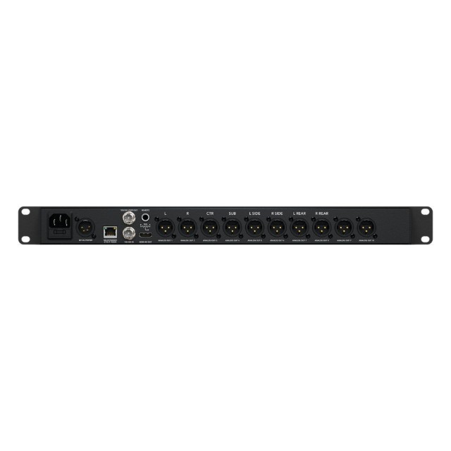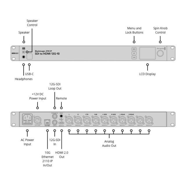 Blackmagic 2110 IP SDI na HDMI 12G-10 uključuje deset kanala XLR analognog audio izlaza za praćenje surround zvuka, što omogućuje daljinsku kontrolu glasnoće i podesivu odgodu , idealno za usklađivanje zvuka s TV-ima i projektorima. Sadrži promjenjivo pojačanje i kašnjenje za savršenu AV sinkronizaciju i 3D LUT-ove za točnu kalibraciju boja HDMI zaslona. Uređaj ima prednji LCD zaslon s pregledom videa, razinama zvuka i izbornicima, kao i izlaz za zvučnik i slušalice.