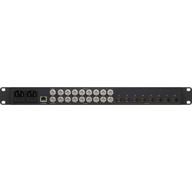 Dvosmjerni 8-kanalni 12G-SDI 2110 IP pretvarač s 8 10G Ethernet SFP modula za optička vlakna. uključuje upravljačku ploču i LCD za status i podržava HD i Ultra HD standarde do 2160p60. Dostupan od 5/2024 .
