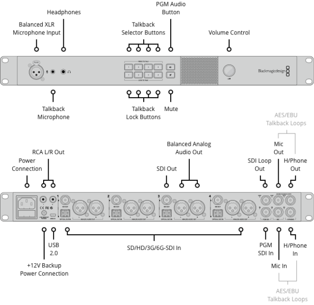 Integrirane komunikacijske funkcije također uključuju prolazno AES/EBU sučelje za povezivanje drugih ATEM Studio Converter uređaja.