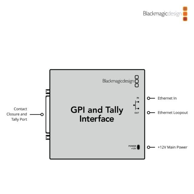 Jedinica GPI i Tally sučelja tvrtke Blackmagic Design je Ethernet uređaj koji pruža osam izlaza s relejnim kontaktima za svjetlosnu signalizaciju s radnih stanica iznad glave. Tally signali se šalju preko Ethernet mreže iz sklopnika serije ATEM do modula GPI i Tally Interface, koji su spojeni na istu mrežu. GPI i modul sučelja Tally mogu se spojiti (pomoću kabela za prekidanje; nije uključen) na video uređaj koji podržava standard signalizacije na temelju veze kontakata, tj. proizvode Blackmagic Design SmartView Duo ili SmartView HD.