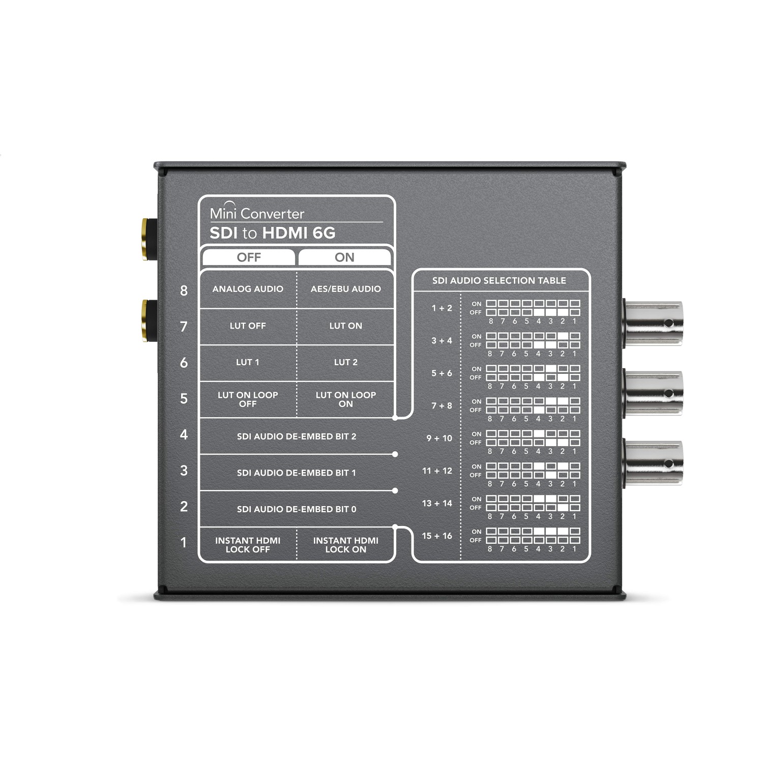 Model Mini Converter SDI to HDMI 6G također nudi punu podršku za 3D LUT tablice od 33 točke za vrlo preciznu konverziju boja. LUT korekcije mogu se primijeniti, na primjer, za pregled planiranih prilagodbi boja videozapisa, izravno tijekom snimanja. 3D LUT datoteke su kompatibilne s DaVinci Resolve, tako da se iste korekcije boja mogu koristiti tijekom produkcije i postprodukcije video materijala. Audio podrška je jednako opsežna: model Mini Converter SDI to HDMI 6G može de-embedirati audio sa SDI linije na HDMI, proizvod HDMI to SDI 6G, s druge strane, može se koristiti za ugradnju zvuka u SDI signal iz HDMI, simetričnih analognih ili digitalnih AES/EBU audio ulaza.