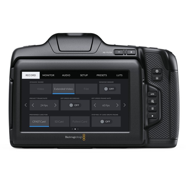 Na stražnjoj ploči uređaja nalazi se veliki, 5" zaslon osjetljiv na dodir koji olakšava kompoziciju snimaka i precizno fokusiranje. Monitor prikazuje informacije o statusu kamere, histogramu, izlazu funkcije pomoći pri fokusiranju, razinama, vodičima itd. Model Pocket Cinema Camera 6K Pro je novo opremljen naprednim HDR LCD zaslonom sa svjetlinom od 1.500 cd /m 2 zbog dobre čitljivosti čak i na jakom suncu, štoviše, može se lako postaviti.
