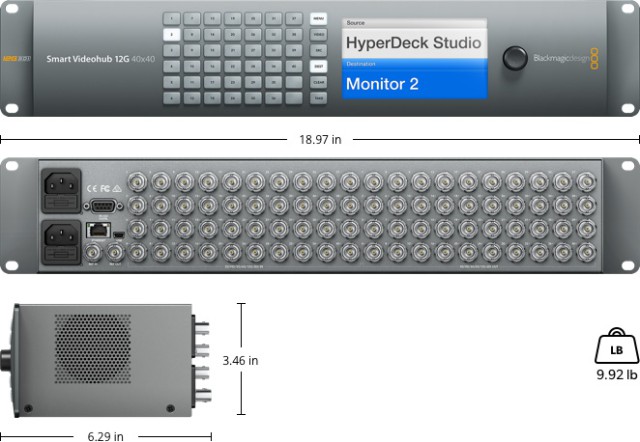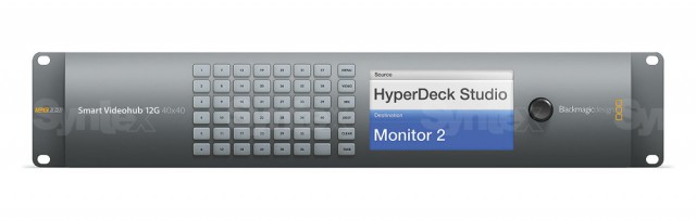 Smart Videohub 12G 40x40 novi je video usmjerivač s 12G-SDI tehnologijom za podršku svim SDI formatima do rezolucije 2160p60. Blackmagic Smart Videohub 12G 40x40 nudi potpune kontrole na prednjoj ploči, dvostruko napajanje, opciju daljinskog upravljanja preko Etherneta, RS-422 priključak ili ulaz/izlaz za sinkronizaciju. Daljinsko upravljanje u Ethernet mrežama ostvaruje se pomoću aplikacije Blackmagic Design Router Control ili preko hardverskih kontrolnih ploča Blackmagic Smart Control i Master Control.