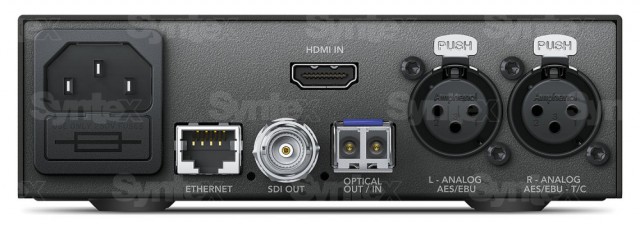 Prednja ploča sadrži kontrole i zaslon u boji za prikaz signala prisutnog na video ulazu, audio mjerače i indikator video formata. Stražnja ploča nudi Quad Link 12G-SDI sučelje kompatibilno sa HD, Ultra HD i 8K standardima. Tu su i dva DisplayPort konektora: jedan standardni, a drugi u stilu USB-C konektora za nove monitore, kao što je Pro Display XDR. Integrirana funkcija za promjenu video rezolucije jamči prisutnost ispravnog video signala za monitor spojen na DisplayPort sučelje.