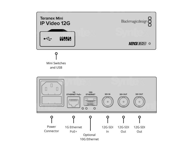Prenesite SDI video podatke koristeći IP mreže ili pretvorite IP video natrag u SDI! Teranex Mini IP Video 12G koristi standardne softverske i hardverske konfiguracijske panele Blackmagic Videohub i omogućuje vam rad s IP videom jednako lako kao i sa SDI signalom. Pretvara SDI video u TICO kodek ("TIny COdec", 4:1 kompresija, 35 linija latencija u načinu rada niske latencije, 2 okvira u načinu rada Clean Switch), koji se lako može prenijeti preko IP mreža pomoću integriranog 1G Ethernet sučelja ili pomoću ( opcija) optički 10G SFP modul. Druga jedinica bilo gdje na mreži može se koristiti za obrnutu konverziju u HD-SDI/6G-SDI/12G-SDI sučelje. Interno 1G Ethernet sučelje podržava TICO format s rezolucijom do 1080p60, opcijski 10G SFP modul podržava Ultra HD rezoluciju do 2160p60.
