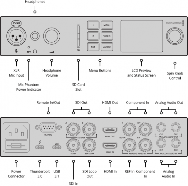 UltraStudio 4K Mini je lako prenosivo rješenje za video snimanje i reprodukciju sa sučeljima Thunderbolt 3, 12G-SDI i HDMI 2.0... Podržava sve standardne 8 i 10-bitne video formate do DCI 4Kp60 ili 12-bitni do DCI 4Kp30. Kompaktno kućište može se jednostavno ugraditi u stalak (i njime se upravlja zasebno), prednja ploča opremljena je kontrolnim gumbima, LCD zaslonom za pregled, ulazom za mikrofon (XLR), 1/4" izlazom za slušalice i utorom za SD karticu koji omogućuju jednostavno rad sa snimljenim materijalom znatno olakšava korištenje. Stražnja ploča sadrži npr. USB-C sučelje za povezivanje tipkovnice i miša s glavnim računalom, SDI, HDMI i analogno A/V sučelje; sučelje Thunderbolt 3 također podržava punjenje povezanog prijenosnog računala (do 45 W).