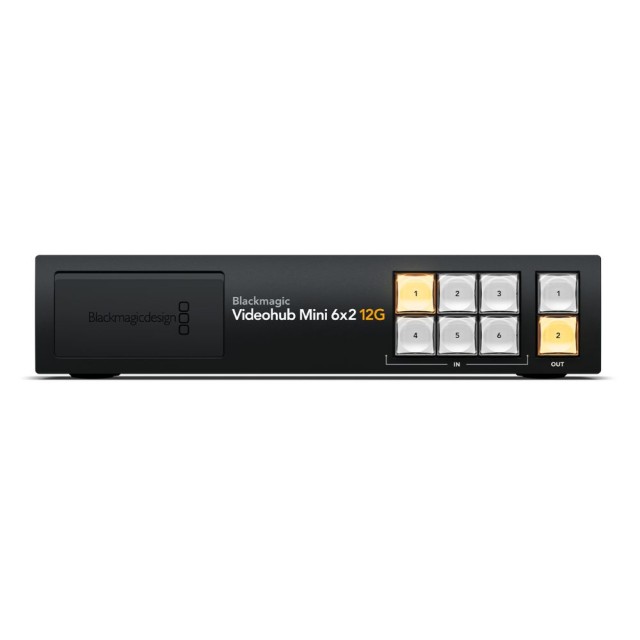 Nudi 6 12G-SDI ulaza i 2 12G-SDI izlaza u ultra-malom dizajnu širine 1/2 rack-a . Izlaz petlje dostupan je za svaki ulaz. Blackmagic Videohub Mini 6x2 12G prikladan je za klijente koji rade u ograničenim prostorima i žele proširiti broj ulaza na svojoj SDI opremi. Uz dodavanje dodatnih ulaza za SDI opremu za emitiranje, Blackmagic Videohub Mini 6x2 12G također uključuje 12G-SDI veze koje rade na svim SD, HD i Ultra HD video standardima do 2160p60 , referentni ulaz i čisti prekidač koji se može odabrati na video izlazima. To vam omogućuje da, na primjer, prebacite određeni izvor na samo jedan izlaz, dok se isti izvor može istovremeno usmjeriti kao izravan izlaz na druge izlaze .