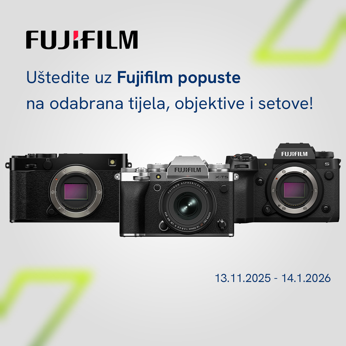 Imamo ekskluzivni božićni popust za vas na odabrane FUJIFILM proizvode! Po cijeni do 500 € niže dobit ćete desetke od nas Fujifilm tijela, objektivi i setovi . Iskoristite prednosti snižene cijene i uživajte u vrhunskoj kvaliteti slike, dizajnu i pouzdanosti koju donosi FUJIFILM.