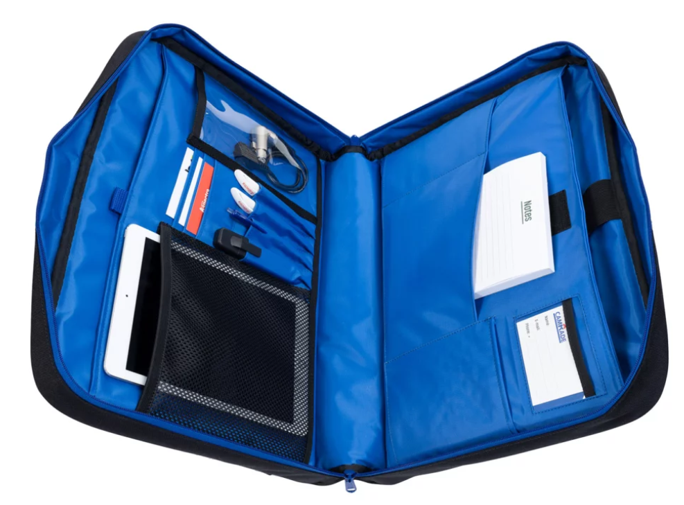 CamRade comPanion je poslovna torba profesionalne kvalitete, dizajnirana da vašu ključnu opremu za produkciju održi sigurnom, organiziranom i lako dostupnom. Izrađena od izdržljivog crnog Cordura® tkanja 1000 dena vodootpornih svojstava, torba nudi maksimalnu zaštitu zahvaljujući svojoj podstavljenoj konstrukciji i visokokvalitetnim YKK® patentnim zatvaračima. Unutra, mekani plavi najlonski interijer s podstavom ima više praktičnih džepova i mrežastih pretinaca za alate, dokumente i sitnice, dok veliki podstavljeni pretinac s elastičnom kopčom na čičak sigurno drži vaš laptop. Namjenski pretinac za tablet dodatno poboljšava organizaciju. Dizajniran za česte putnike, comPanion uključuje džep sa zatvaračem na stražnjoj strani koji se bez napora navlači preko ručki prtljažnih kolica, kao i podstavljene ručke od brušene kože i uklonjivu, podesivu naramenicu za optimalnu udobnost nošenja. Dimenzije odobrene za let osiguravaju jednostavno unošenje ručne prtljage na komercijalne letove. Bilo da ste na setu, na sastancima ili u pokretu, camRade comPanion čuva vašu opremu zaštićenom, organiziranom i spremnom za akciju.