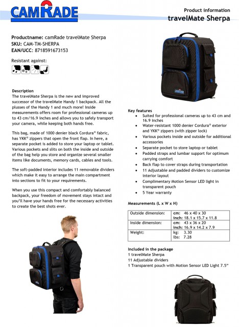 Ruksak za fotoaparat travelMate Sherpa nasljednik je popularnog modela travelMate Handy 1. Nudi dovoljno prostora za siguran transport fotoaparata duljine do 43 cm, izdržljivog materijala (Cordura®) i visokokvalitetnih patentnih zatvarača (YKK®), odvojenog pretinac za tablet/prijenosno računalo na prednjoj strani i naravno također unutarnje i vanjske džepove za transport dokumenata, memorijskih kartica, kablova itd.