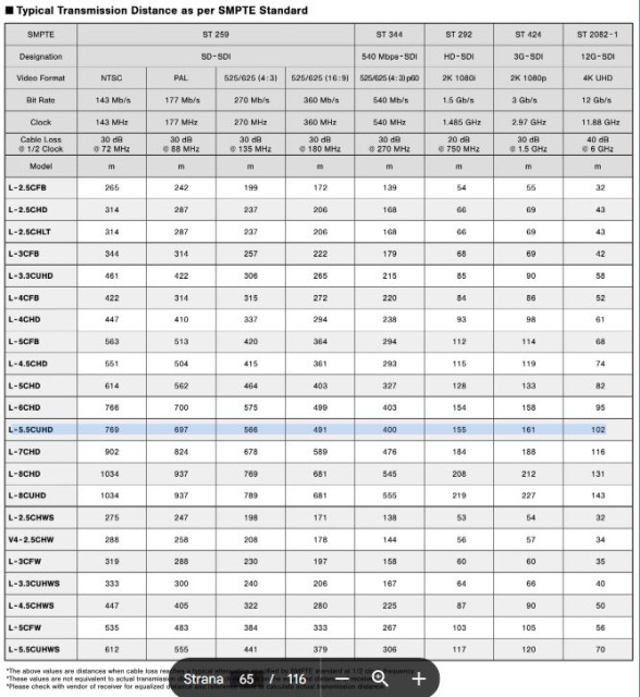 Posebno 12G-SDI koaksijalno kabliranje (SMPTE 2082-1). Prigušenje 39,1 dB / 100 m @ 6 GHz pri promjeru od 7,7 mm i težini od 7,1 kg / 100 m. Impedancija 75 ohma, kapacitet 52 pF/m. Mogućnost provođenja 12G-SDI signala na udaljenosti do 102 m (ovisno o korištenoj tehnologiji). Cijena za 1m.