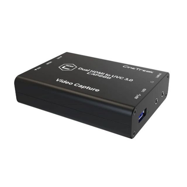 CineTreak CAP20D je profesionalni uređaj za snimanje videa s dvostrukim HDMI na USB 3.0 priključkom koji nudi fleksibilne opcije rasporeda, značajke prebacivanja u stvarnom vremenu, podršku za 3D LUT i chroma keying. Idealan za dinamičko streamanje uživo, podučavanje i stvaranje sadržaja.