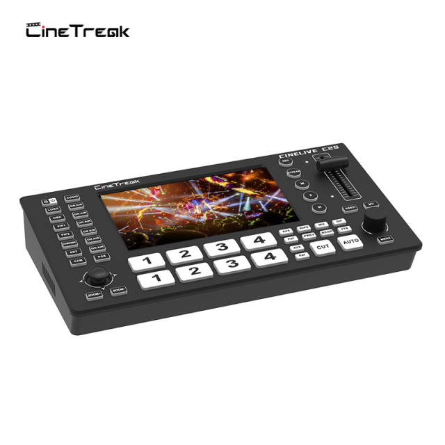 CineTreak Cinelive C2S je kompaktni profesionalni video prekidač s 5,5-inčnim zaslonom osjetljivim na dodir, hibridnom HDMI/SDI ulaznom fleksibilnošću, PTZ upravljanjem kamerom, dvostrukim RTMP streamingom i naprednim chroma/luma keyingom. Izrađen za moderne prijenose uživo i hibridne događaje, kombinira snagu i prenosivost u aluminijskom kućištu.