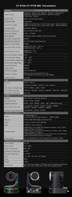 S H.265/H.264/MJPEG kompresijom , CT-PT12 osigurava učinkovito korištenje propusnosti bez ugrožavanja kvalitete. Dodatne značajke uključuju 200 programabilnih unaprijed postavljenih postavki , serijsko upravljanje RS-232/RS-485 i 3,5 mm stereo audio ulaz/izlaz za sinkroniziranu isporuku zvuka i slike.