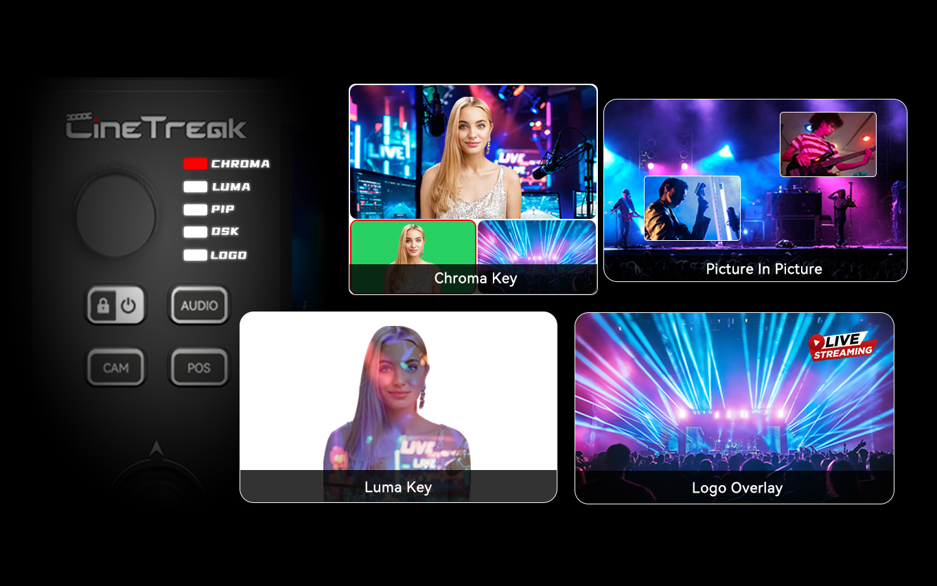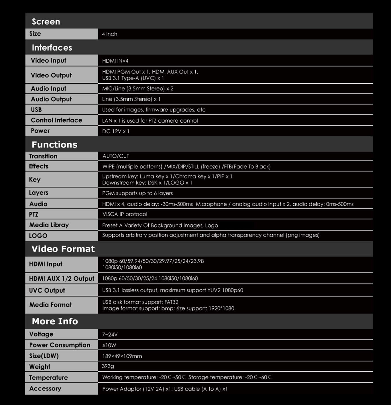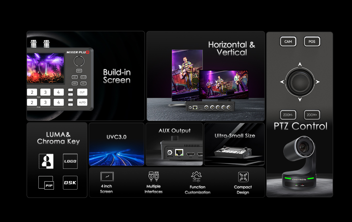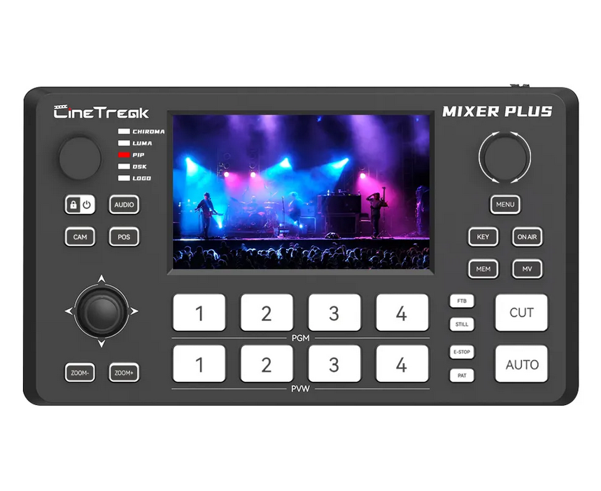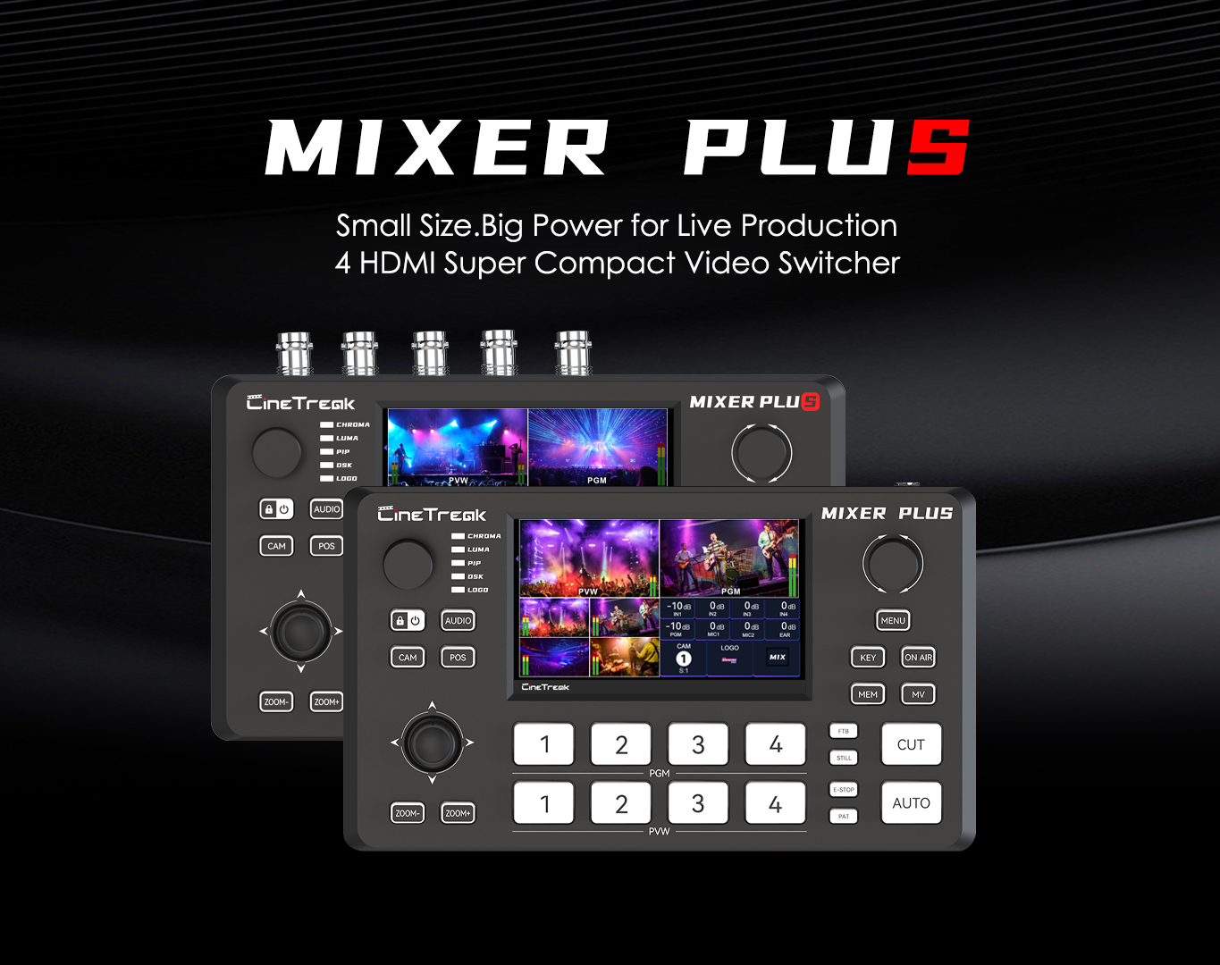 Mixer Plus je moćan i kompaktan video preklopnik dizajniran za prijenos uživo, produkciju događaja i prijenose s više kamera. Dostupan je u dvije verzije kako bi odgovarao različitim potrebama radnog procesa: Mixer Plus s četiri HDMI ulaza i Mixer Plus SDI, koji nudi četiri SDI ulaza za kompatibilnost signala emitiranja. Oba modela podržavaju besprijekorno prebacivanje više kanala, prilagodljiv AUX izlaz i Multi View nadzor u stvarnom vremenu. S do 30 ugrađenih efekata prijelaza - uključujući Mix i DIP - korisnici mogu stvoriti profesionalne promjene scene s podesivim trajanjem. Fleksibilnost zvuka osigurana je dvostrukim ulazima za mikrofon i priključkom za nadzor slušalica, što omogućuje kontrolu zvuka u stvarnom vremenu. Preklopnik također podržava kontrolu PTZ kamera putem VISCA over IP, omogućujući spajanje do četiri kamere s više unaprijed postavljenih postavki po uređaju. Dodatni produkcijski alati uključuju chroma key, luma key, sliku u slici (PIP), downstream keying (DSK) i prekrivanja logotipa. Opremljen USB 3.0 UVC sučeljem za nekomprimirani HD streaming i USB 2.0 priključkom za uvoz medijskih datoteka poput logotipa i pozadina, Mixer Plus i Mixer Plus SDI pružaju cjelovito, svestrano rješenje za prebacivanje prilagođeno profesionalnim kreatorima sadržaja i timovima za produkciju uživo.