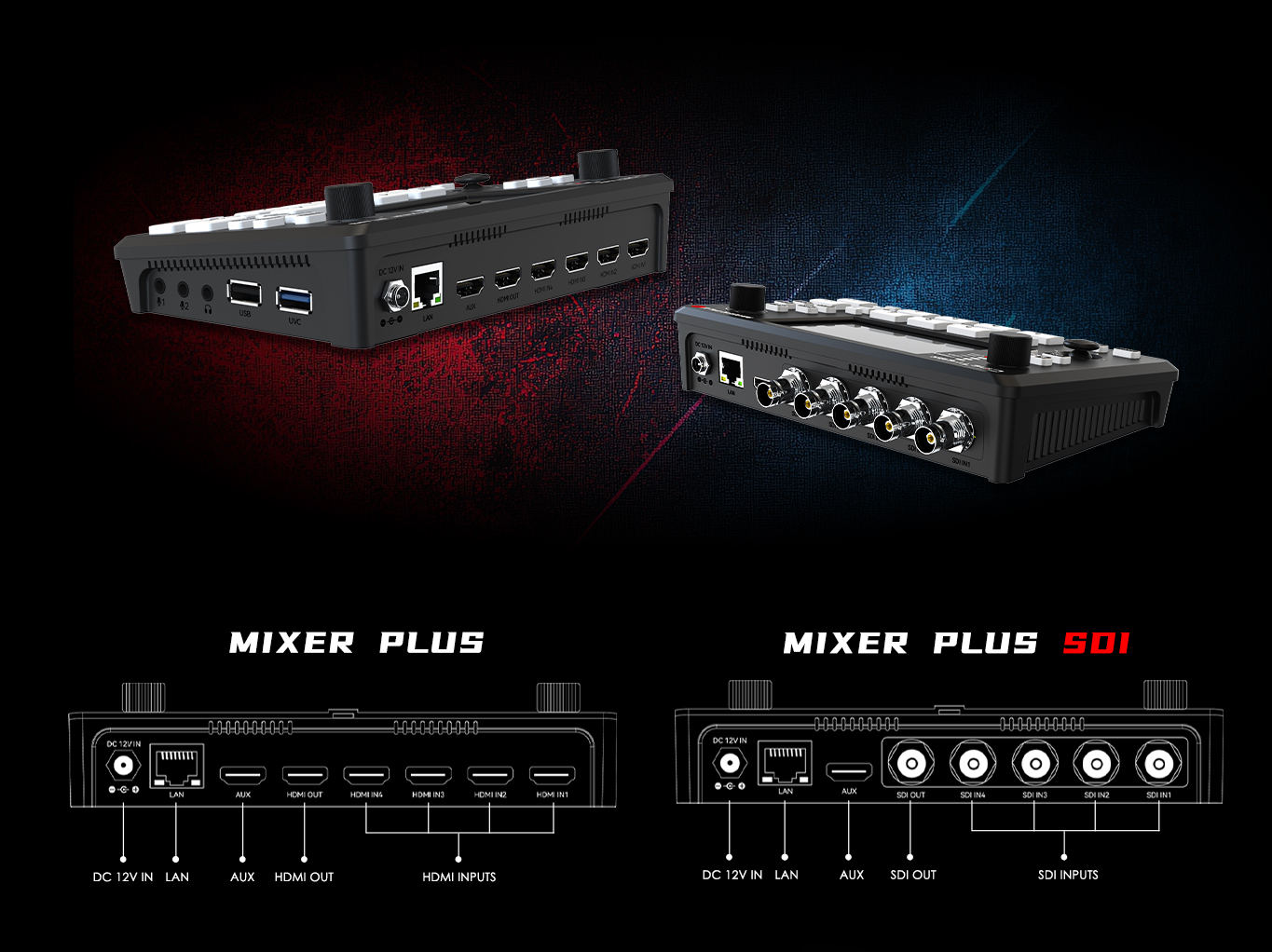 Fleksibilnost više ulaza - Mixer Plus je kompaktan i potpuno opremljen video preklopnik dostupan u HDMI i SDI verzijama, dizajniran da zadovolji potrebe profesionalnih okruženja za produkciju uživo. HDMI verzija dolazi s četiri HDMI ulazna priključka, dok SDI model ima četiri SDI ulaza, a oba podržavaju prebacivanje video signala visoke kvalitete. Svaka jedinica nudi jedan programski (PGM) izlaz i jedan AUX izlaz. AUX izlaz podržava preglede više prikaza kao i prilagodljive izlaze video signala, nudeći iznimnu fleksibilnost tijekom prijenosa uživo. Obje verzije opremljene su LAN priključkom koji se može koristiti za upravljanje PTZ kamerama ili za povezivanje s našim službenim softverom za upravljanje na računalu, što omogućuje potpuni pristup funkcijama uređaja. Dodatne audio značajke uključuju dva linijska audio ulaza i izlaz za slušalice za praćenje zvuka u stvarnom vremenu. Ugrađeni USB 2.0 priključak omogućuje jednostavan uvoz medijskih datoteka kao što su logotipi, pozadine i fotografije, dok brzi USB 3.0 priključak funkcionira kao UVC sučelje, omogućujući snimanje nekomprimiranog HD videa izravno u OBS i drugi softver za prijenos uživo. Bez obzira preferirate li HDMI ili SDI tijekove rada, Mixer Plus pruža pouzdano, fleksibilno i jednostavno rješenje za produkciju uživo s više kamera.