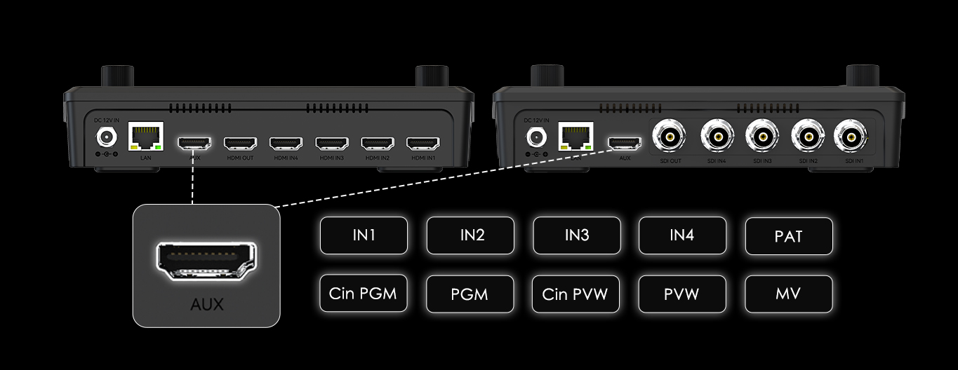 Prilagodljiv AUX HDMI izlaz - Mixer Plus ima svestrani AUX HDMI izlaz koji korisnicima omogućuje prilagodbu izlaznog signala iz više opcija, uključujući IN1, IN2, IN3, IN4, PGM, Clean PGM, PVW, Clean PVW, PAT i Multi View - nudeći maksimalnu fleksibilnost za različite produkcijske potrebe.