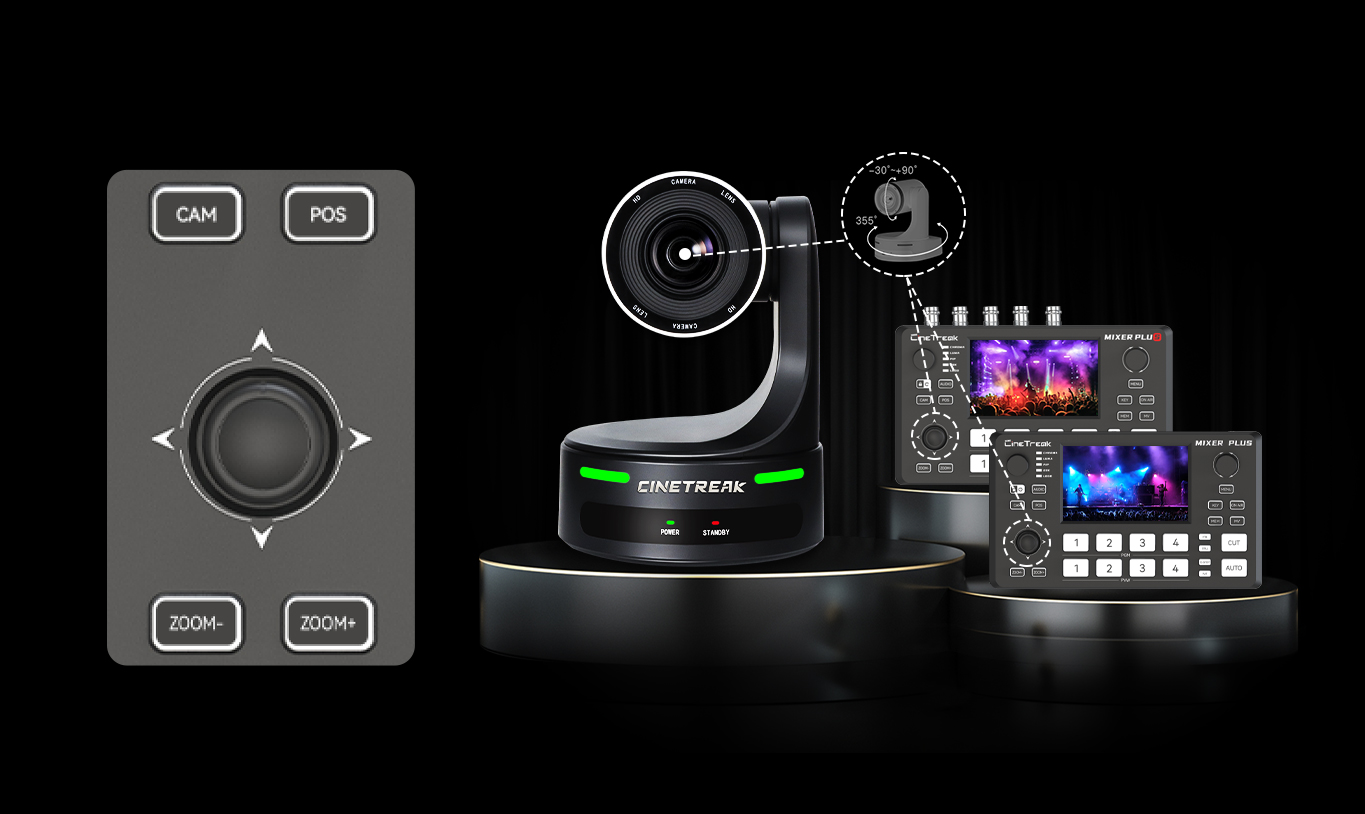 Upravljanje PTZ kamerom putem VISCA over IP - Mixer Plus podržava profesionalno upravljanje PTZ kamerom putem VISCA-over-IP protokola, omogućujući kontrolu do četiri PTZ kamere. Svaka kamera podržava do četiri unaprijed postavljena položaja, što omogućuje brzu i učinkovitu promjenu scene tijekom produkcije.