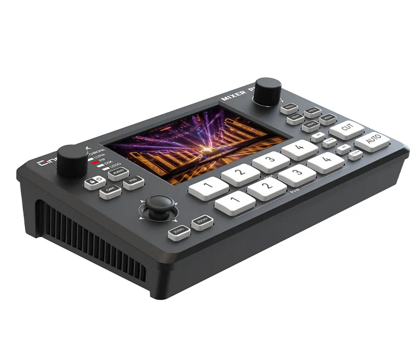 Mixer Plus je moćan i kompaktan video preklopnik dizajniran za prijenos uživo, produkciju događaja i prijenose s više kamera. Dostupan je u dvije verzije kako bi odgovarao različitim potrebama radnog procesa: Mixer Plus s četiri HDMI ulaza i Mixer Plus SDI, koji nudi četiri SDI ulaza za kompatibilnost signala emitiranja. Oba modela podržavaju besprijekorno prebacivanje više kanala, prilagodljiv AUX izlaz i Multi View nadzor u stvarnom vremenu. S do 30 ugrađenih efekata prijelaza - uključujući Mix i DIP - korisnici mogu stvoriti profesionalne promjene scene s podesivim trajanjem. Fleksibilnost zvuka osigurana je dvostrukim ulazima za mikrofon i priključkom za nadzor slušalica, što omogućuje kontrolu zvuka u stvarnom vremenu. Preklopnik također podržava kontrolu PTZ kamera putem VISCA over IP, omogućujući spajanje do četiri kamere s više unaprijed postavljenih postavki po uređaju. Dodatni produkcijski alati uključuju chroma key, luma key, sliku u slici (PIP), downstream keying (DSK) i prekrivanja logotipa. Opremljen USB 3.0 UVC sučeljem za nekomprimirani HD streaming i USB 2.0 priključkom za uvoz medijskih datoteka poput logotipa i pozadina, Mixer Plus i Mixer Plus SDI pružaju cjelovito, svestrano rješenje za prebacivanje prilagođeno profesionalnim kreatorima sadržaja i timovima za produkciju uživo.