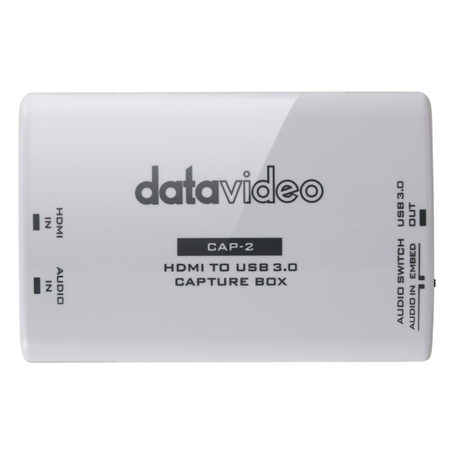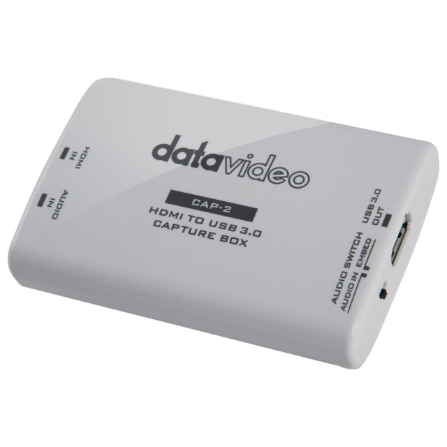 Datavideo CAP-2 je HDMI > USB 3.0 UVC uređaj za snimanje ili strujanje do 1080p50/60 videa s HDMI uređaja na računala s OS Windows, Linux i macOS s bilo kojom od podržanih aplikacija/usluga (OBS, VLC, Skype, itd.). Nudi ugrađenu i vanjsku audio podršku i potpunu plug-and-play instalaciju.