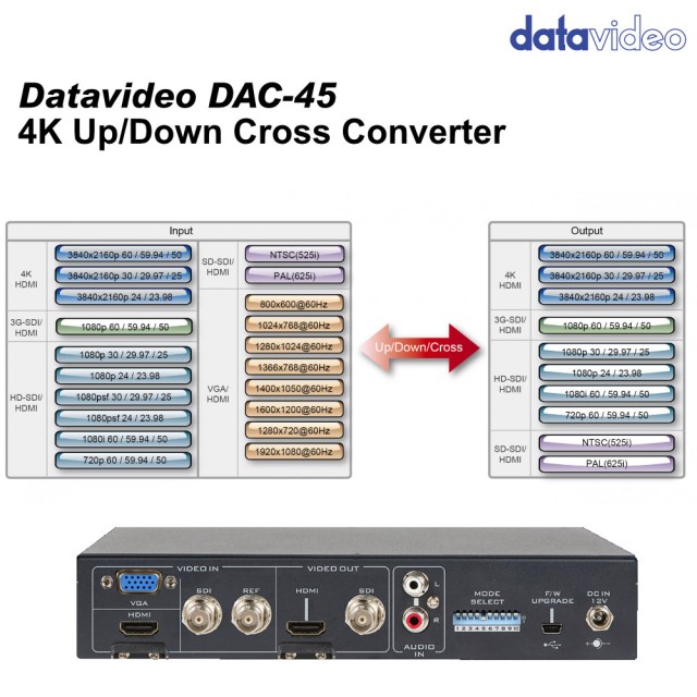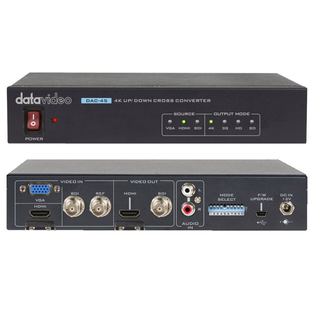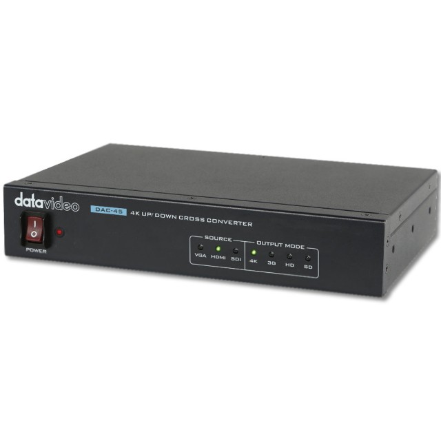 Datavideo DAC-45 4K Up/Down/Cross Converter omogućuje korisnicima prebacivanje između različitih video formata i pretvaranje rezolucije gore/dolje, postižući besprijekornu konverziju VGA, HDMI i SDI videa u 4K HDMI ili 1080p HDMI/SDI signal. DAC-45 ima sve značajke koje trebate, prenosiv je i jednostavan za korištenje.