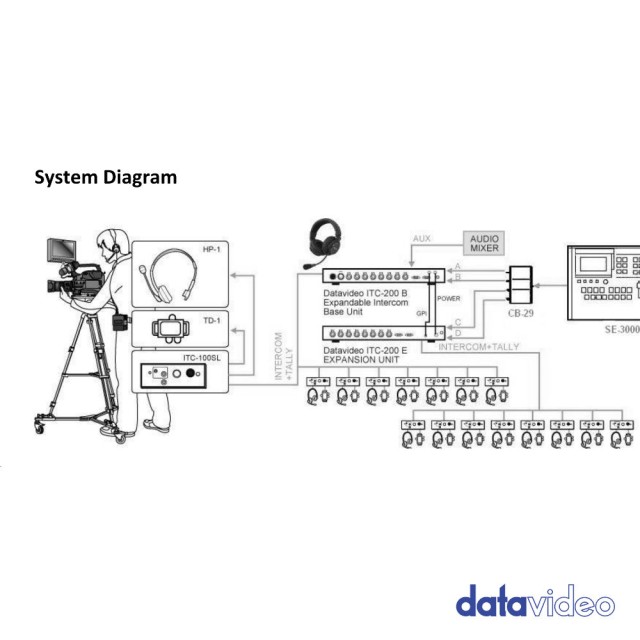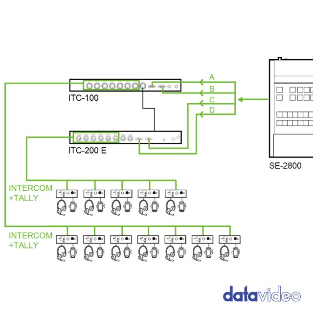 ITC-200E pruža dodatnih 8 kanala Datavideo ITC-100 sustavu za razgovor/povratni prijenos. Ova kombinacija ITC-100/ITC-200E učinkovito vam daje sustav od 15 kanala. Kombinacija ITC-100/ITC-200E omogućuje operateru da razgovara s kanalima 1-7 odvojeno, a s ostalih 8 kao grupom ili sa svih 15 kanala odjednom.