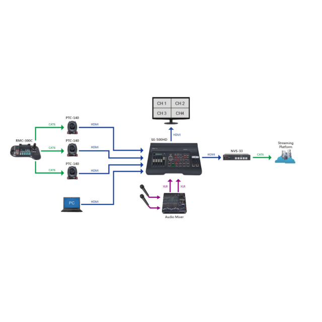 Kompaktna kombinacija četverokanalnog stropa i Datavideo SE-500HD upravljačke ploče omogućuje rukovanje izvorima signala s razlučivošću do 1080p uklj. mogućnosti kombiniranja različitih rezolucija. Unatoč niskoj kupovnoj cijeni, također nudi funkciju tipkanja (Luma), efekt "slika u slici" ili dijeljenje zaslona za npr. podcast intervjue. Tu je i integrirani audio miks stol ili multiview izlaz (uključujući prikaz četiri videa u portretu).