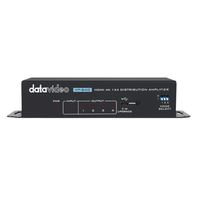 Datavideo VP-840 je HDMI 1x4 distribucijsko pojačalo s mogućnošću uzastopnog prijenosa HDMI izvora na 4 zaslona istovremeno. VP-840 podržava brzinu prijenosa do 18 Gbps i rezoluciju od 4K2K@60Hz te je kompatibilan s HDMI 2.0 i HDCP 2.2. VP-840 ima EDID upravljanje s funkcijom automatskog smanjenja veličine, pružajući više EDID opcija za različite izlazne rezolucije između svih uređaja i osiguravajući ispravan prikaz sadržaja HDMI izvora na monitorima.