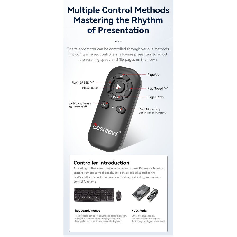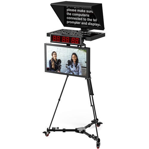 Teleprompter uključuje profesionalni softver za sugestije s ključem za šifriranje, što osigurava siguran i stabilan rad na Windows sustavima. Višestruke mogućnosti upravljanja dostupne su putem bežičnog Bluetooth daljinskog upravljača i žičane nožne papučice, što omogućuje voditeljima ili operaterima besprijekorno podešavanje brzine pomicanja i reprodukcije. Dizajniran za mobilnost, cijeli sustav pakira se u izdržljivo aluminijsko kućište s kotačima, što prijevoz između studija i lokacija čini jednostavnim i sigurnim.
