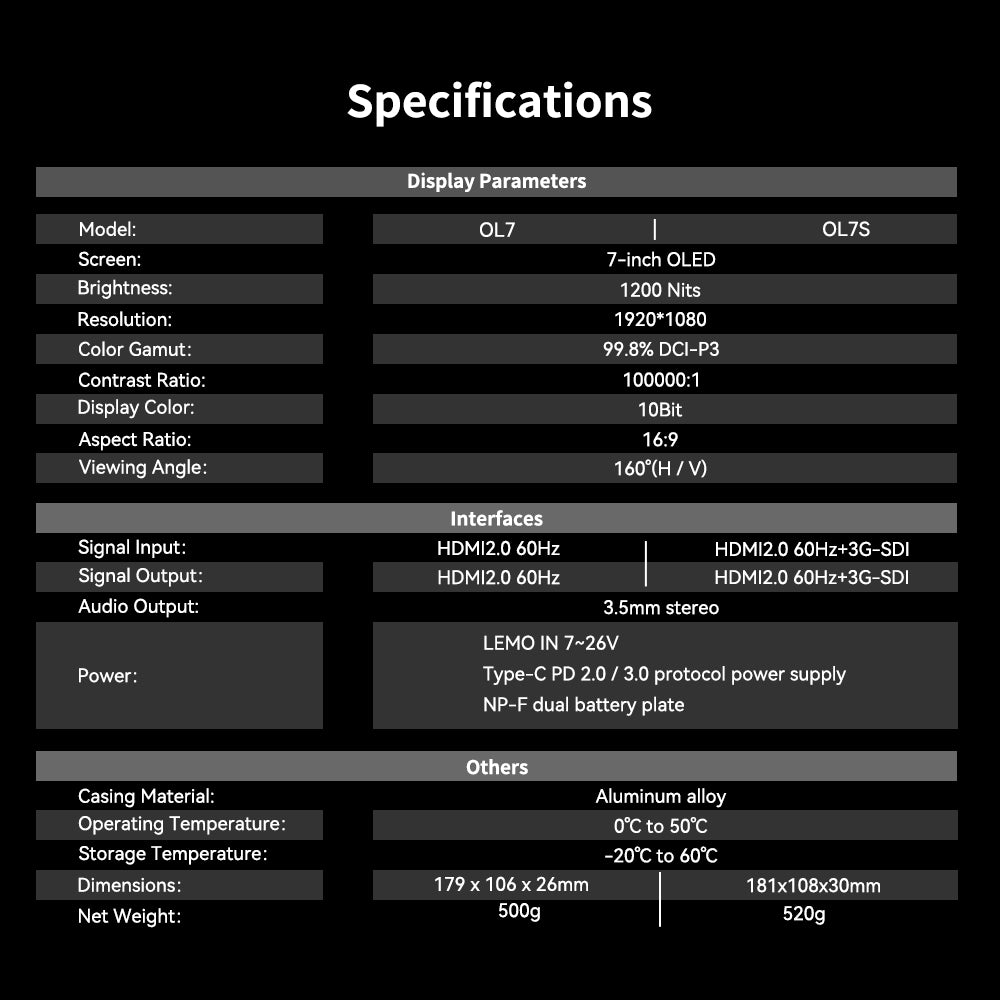 Desview OL7 je 7-inčni OLED monitor s ultra-svijetlim zaslonom od 1200 nita , 4K60p HDMI i impresivnim omjerom kontrasta od 100 000:1 . S 10-bitnom dubinom boje za 1,07 milijardi boja , pruža zadivljujuću točnost i jasnoću za profesionalne filmaše i kreatore sadržaja.