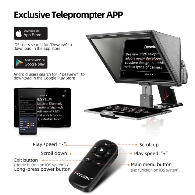 Profesionalni teleprompter Desview T12S s kataloškim brojem des-T12S omogućit će vam glatko čitanje scenarija prilikom snimanja videa ili prezentacija. Ovaj moćni teleprompter idealan je za vlogere, kreatore sadržaja, profesionalne voditelje i za korporativne svrhe. Svojom jednostavnošću korištenja i visokom pouzdanošću, Desview T12S pomoći će vam da postignete profesionalne rezultate i povećate samopouzdanje pred kamerom. Otkrijte novi standard za čitanje teksta tijekom bilo kojeg snimanja.