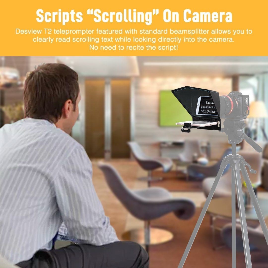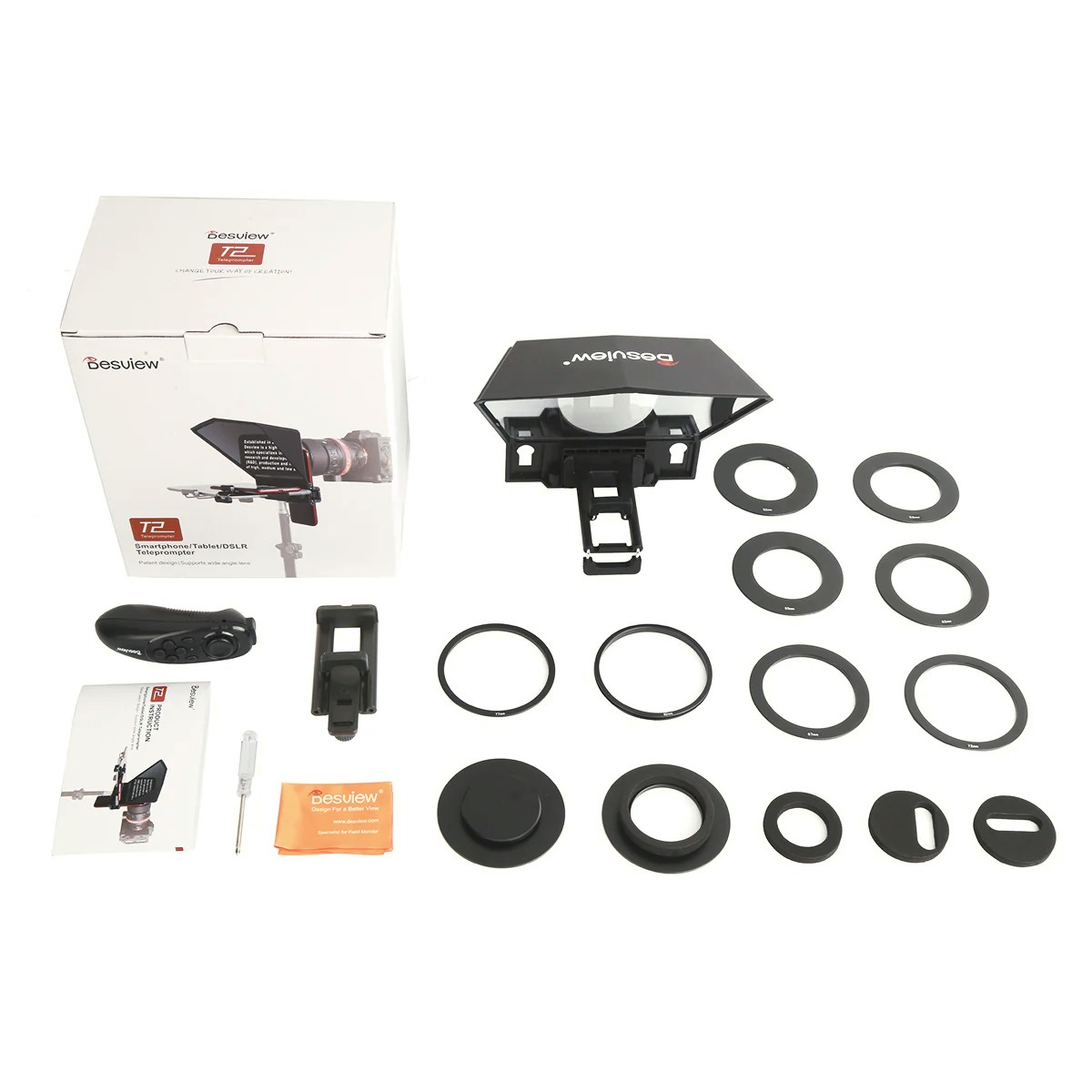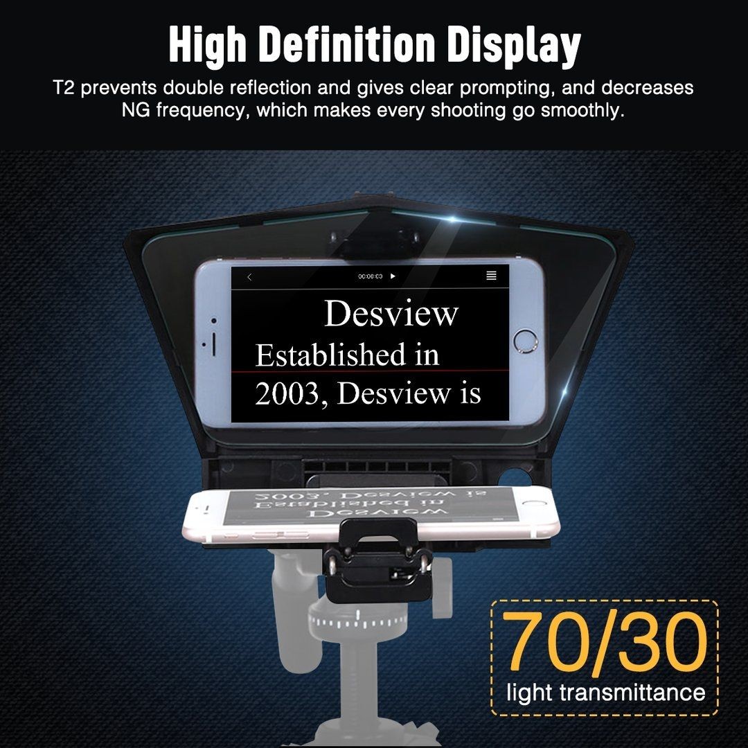 T2 se vyznačuje lehkým, přenosným tělem o hmotnosti pouhých 340 gramů, obsahuje přední a zadní kryty pro ochranu před prachem a poškrábáním a podporuje širokoúhlé objektivy nad 40 mm bez vinětace. Teleprompter nabízí několik možností umístění zařízení (vertikálně nebo horizontálně) a podporuje fotografování zleva/zprava. Uživatelé mohou skripty ovládat na dálku pomocí bezplatné aplikace Desview a upravovat rychlost posouvání, text a barvu pozadí. Součástí balení je devět profesionálních adaptérových kroužků (49–82 mm), které zajišťují kompatibilitu s většinou objektivů DSLR a zároveň snižují únik světla.