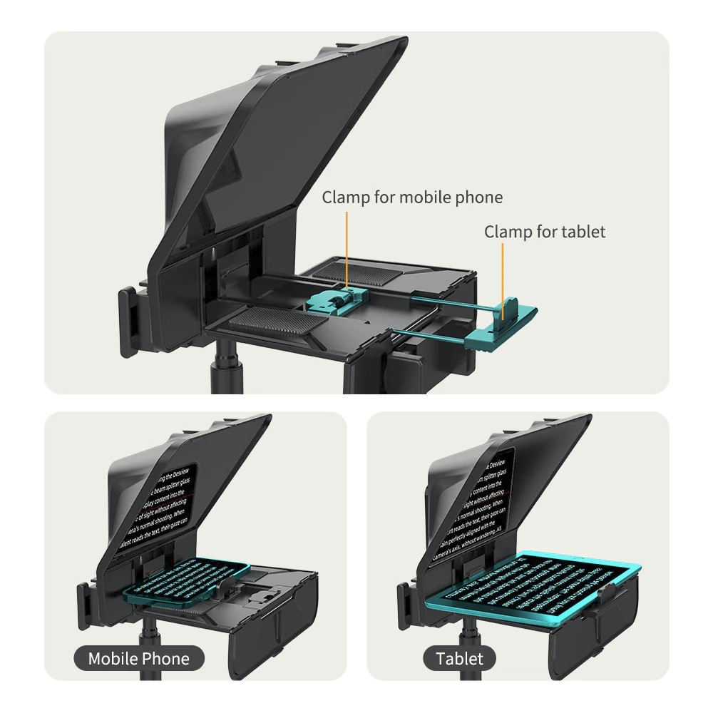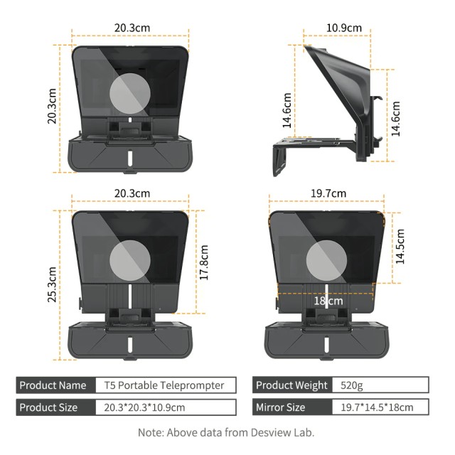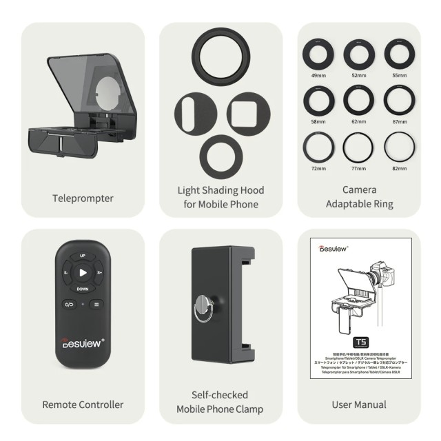 Desview T5 je inovativan prijenosni teleprompter s dva zaslona dizajniran za prirodan kontakt očima i samouvjereno izlaganje tijekom prijenosa uživo, vlogova, online tečajeva i intervjua. Uz stakleni razdjelnik snopa emitirane kvalitete, Bluetooth daljinski upravljač i široku kompatibilnost s uređajima, omogućuje glatke, profesionalne prezentacije s lakoćom.