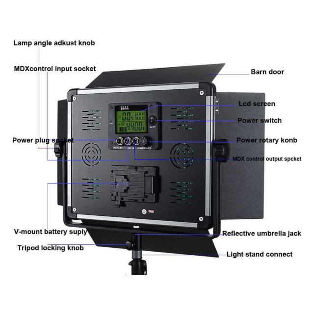 Digitalni zaslon, DMX 512, ručna kontrola. Materijal: aluminij. LED izvor svjetla, kut svjetla 60 stupnjeva, CRI 97RA. Podrška za baterije: SONY NP-F550, F750, F970 baterija. IZMJENIČNA STRUJA 100-250 VA ISTOSMJERNA STRUJA 14,5 V