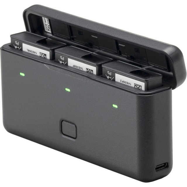 Pohranite, zaštitite i brzo napunite do tri baterije za svoje DJI Osmo Action 5, 4 ili 3 kamere pomoću višenamjenskog kućišta za baterije koje ima USB-C punjenje i microSD pohranu.
