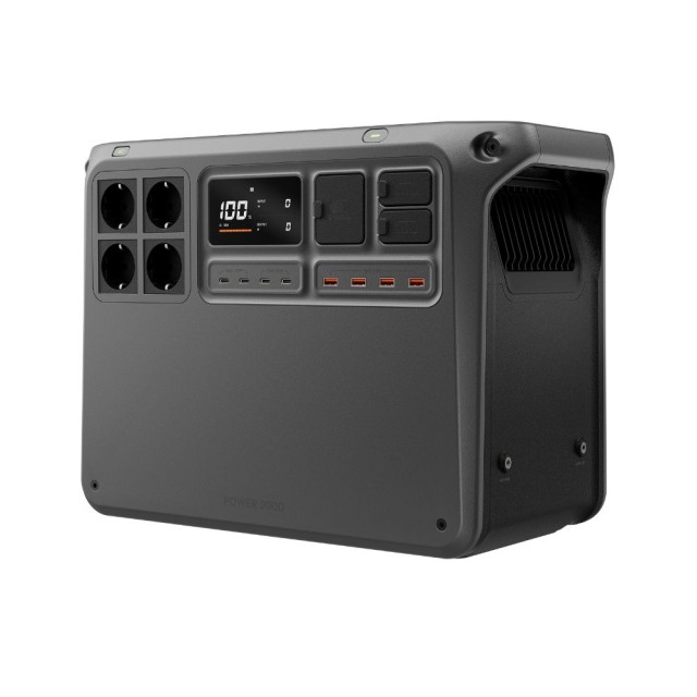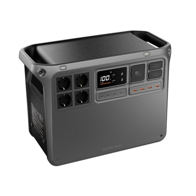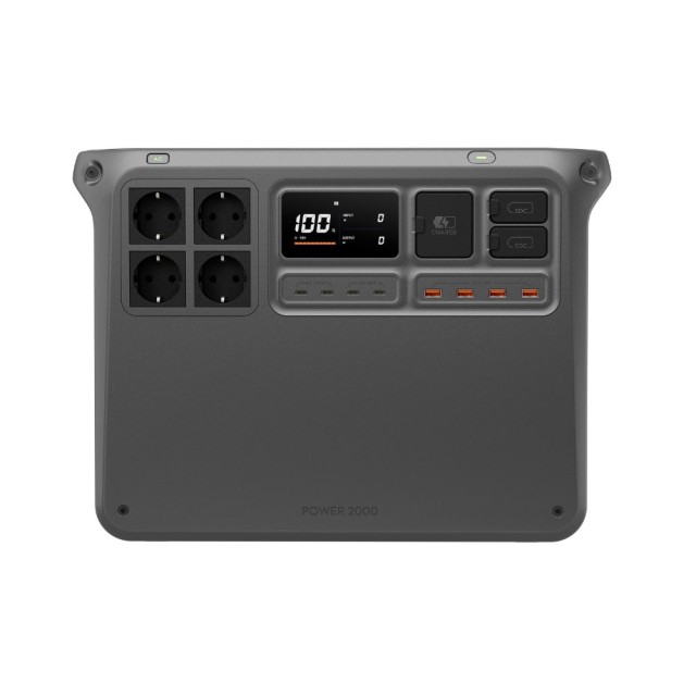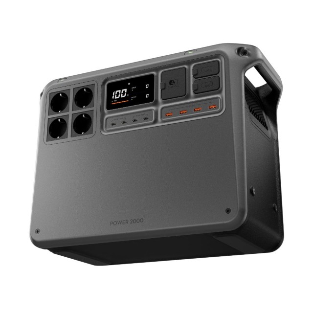 Power 2000 nudi dva USB-C priključka od 140 W , dva USB-C priključka od 65 W , četiri USB-A priključka , četiri AC utičnice , dva puna SDC priključka i dva navoja od 1/4" , što vam omogućuje spajanje širokog raspona DJI Power dodatne opreme, solarnih panela, kabela za napajanje i adaptera po potrebi.